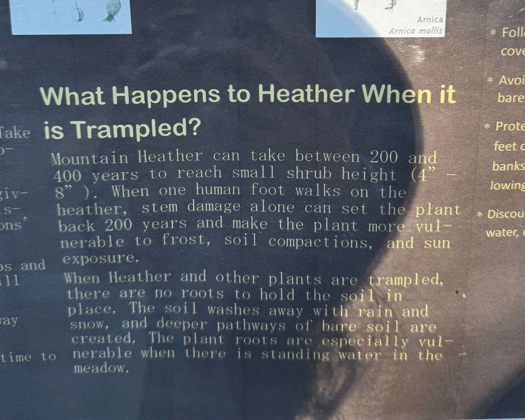 We arrived to the Lower Level Panther Meadow parking lot and walked to our left up the trail. We stopped to read the “Shasta-Trinity National Forest Sign” which was about taking care of the space. The wildflowers are very delicate and it is important not to step on them. In particular, there was concern about the Heather, which is not only my name, but also a type of flower. A section of the sign said, “What Happens to Heather When it is Trampled?” It was such a synchronicity for me that I was so called to this spot, which also holds so much of the energy of my name. I can tell you from personal experience what happens when Heather is trampled on, so the sign made me laugh. I can even tell you that Heather has been capable of self-trampling.
